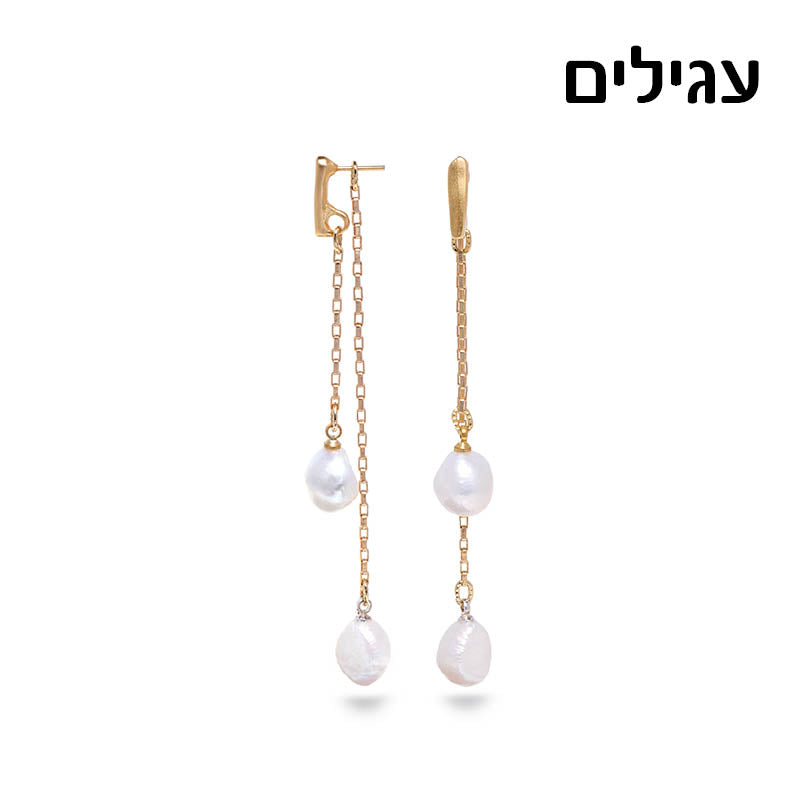 עגילים נוצצים וקלאסיים משובצים בפנינה.זוג עגילים יפייפה המצופה זהב 24 קראט, משובצים פנינה אורגנית לבנה ועגולה.אורך: 2.5ס"מ. ...